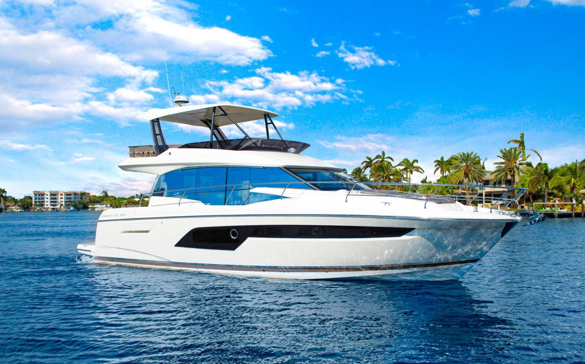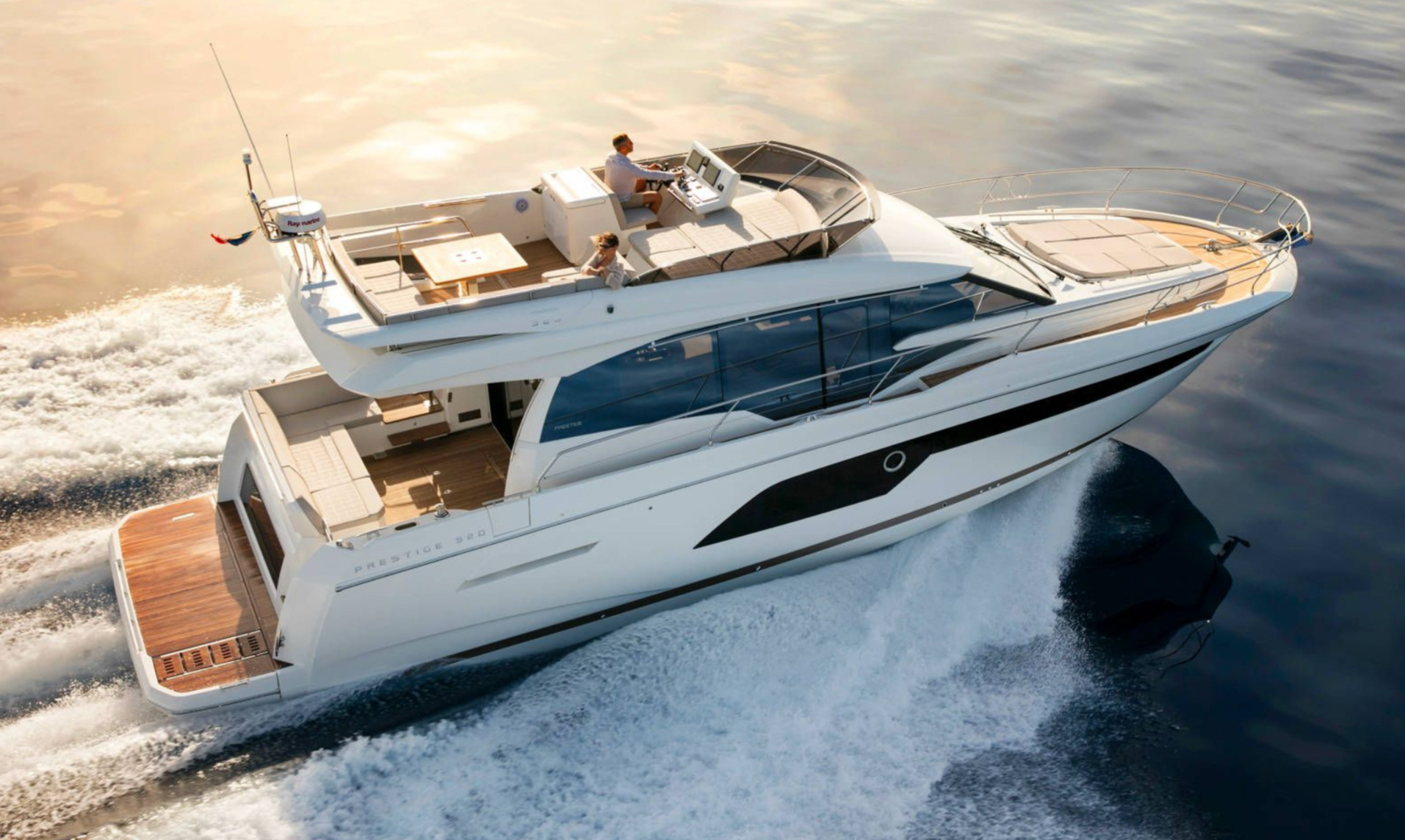 The Prestige 520 Fly, a jewel in the Prestige Yachts collection, is a 16-meter flybridge yacht that seamlessly blends dynamic elegance with absolute comfort. Featuring an exceptionally large XXL flybridge unique in its class, it provides generous living spaces: an outdoor lounge, fully equipped kitchen, helm station, and expansive relaxation areas to fully embrace life at sea.